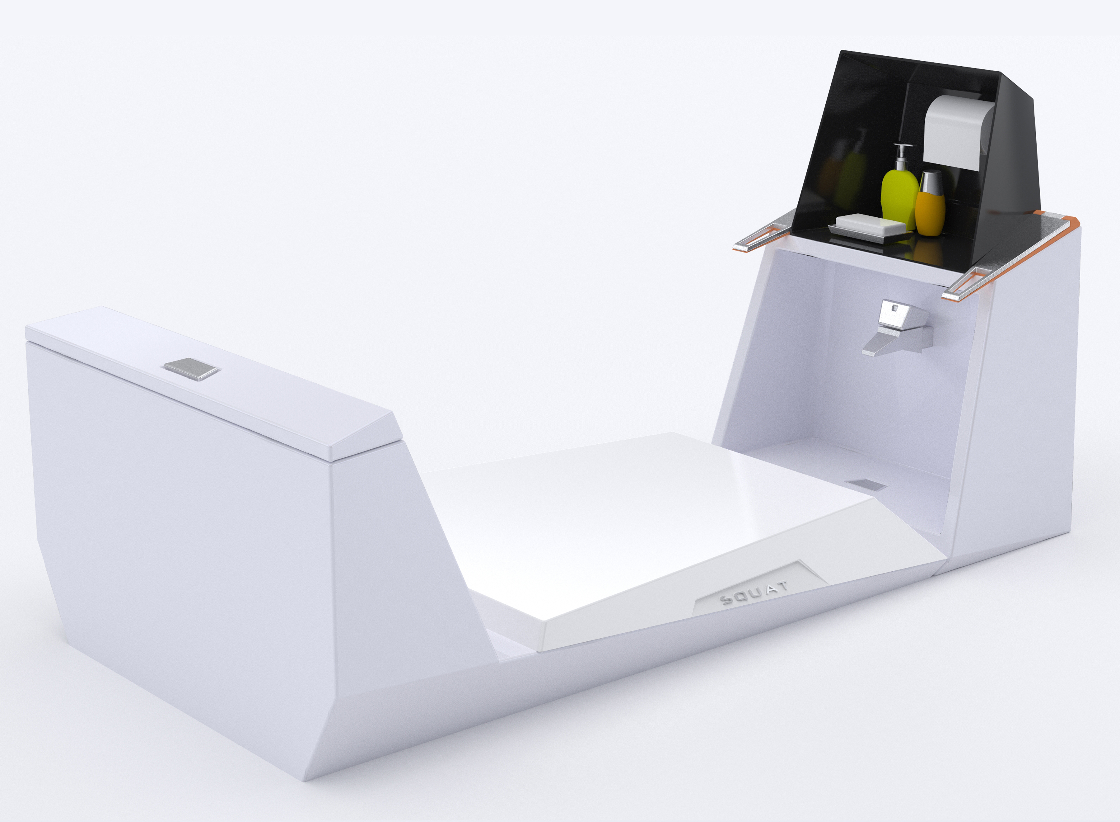 Third prize: "Squat - The Fitness Machine" by Suman Swarup Prusty (India, Suman Swarup). A solution that enhances the advantages of squat toilets with a finish of maximum comfort and hygiene that makes it look like a fitness machine.